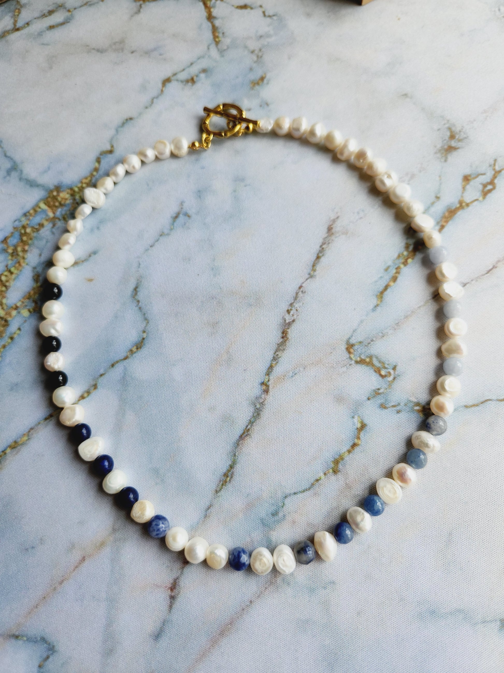 This gradient blue Aquamarine, Aventurine, Sodalite, Lapis Lazuli, Obsidian and white keshi pearl necklace in gold accent can be worn daily for healing, wisdom and anti-anxiety.