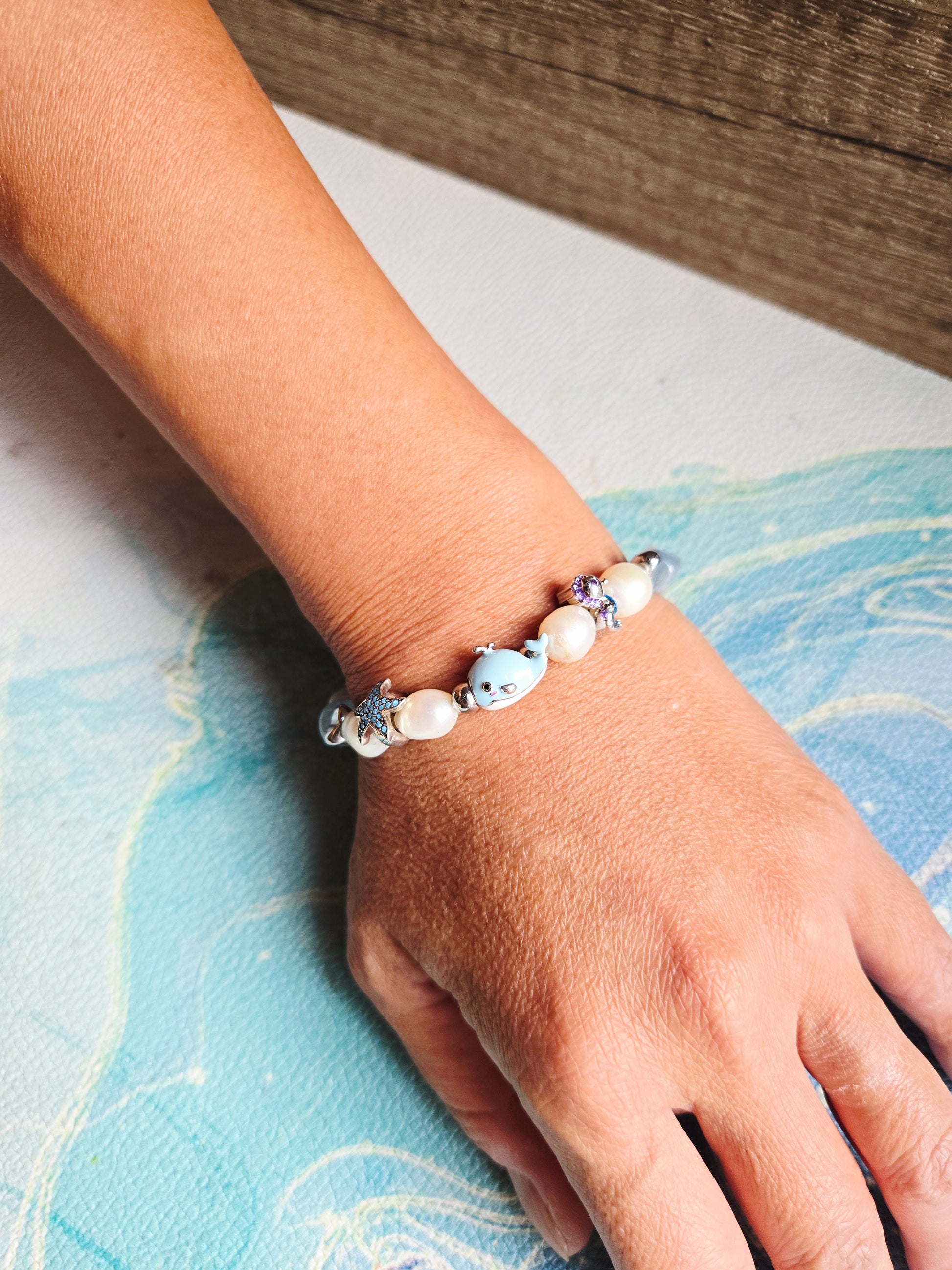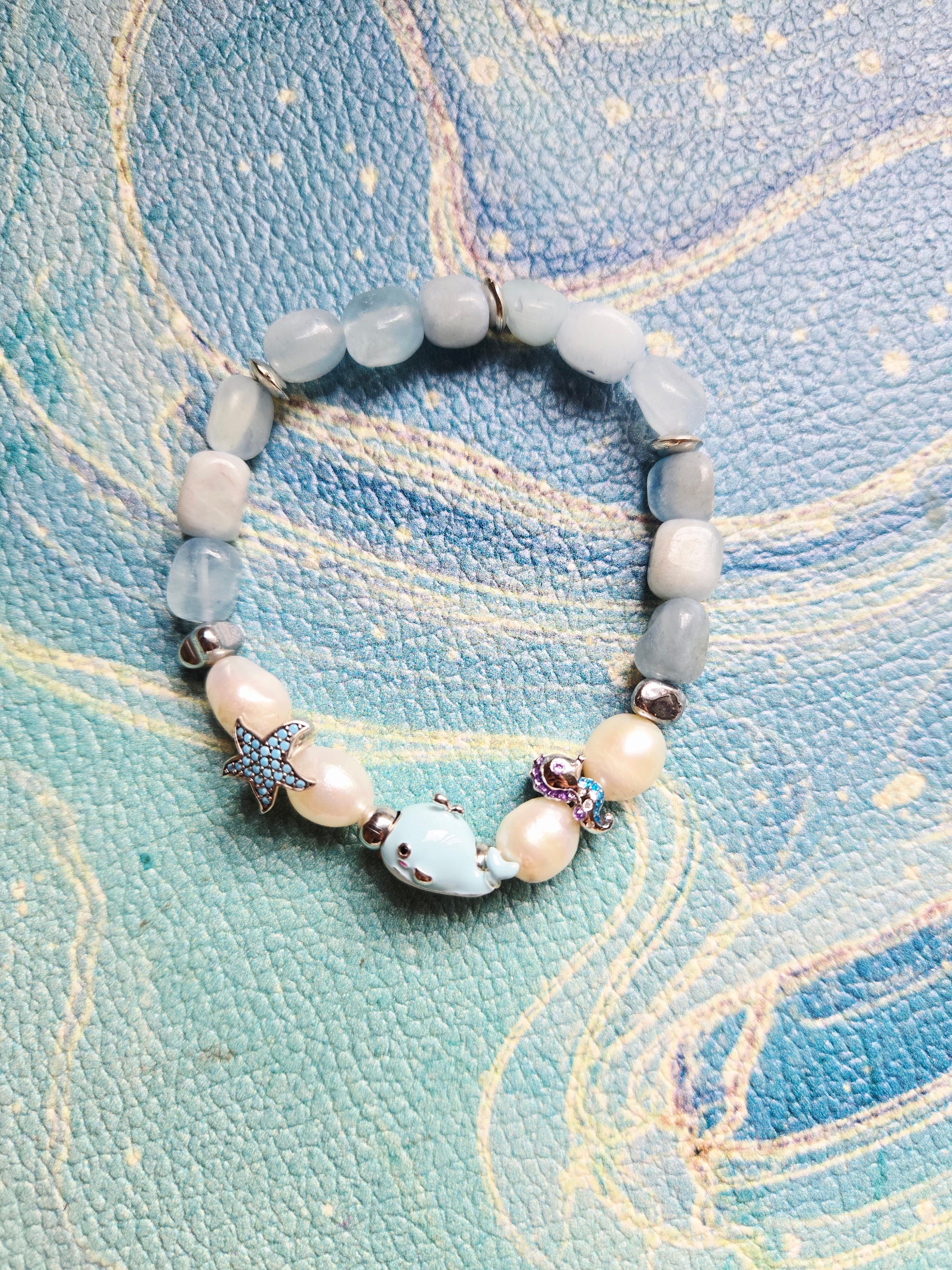 Channel your inner Boho Mermaid with this Aquamarine and Pearl bracelet with Starfish, Whale and Seahorse charms. With silver accents.