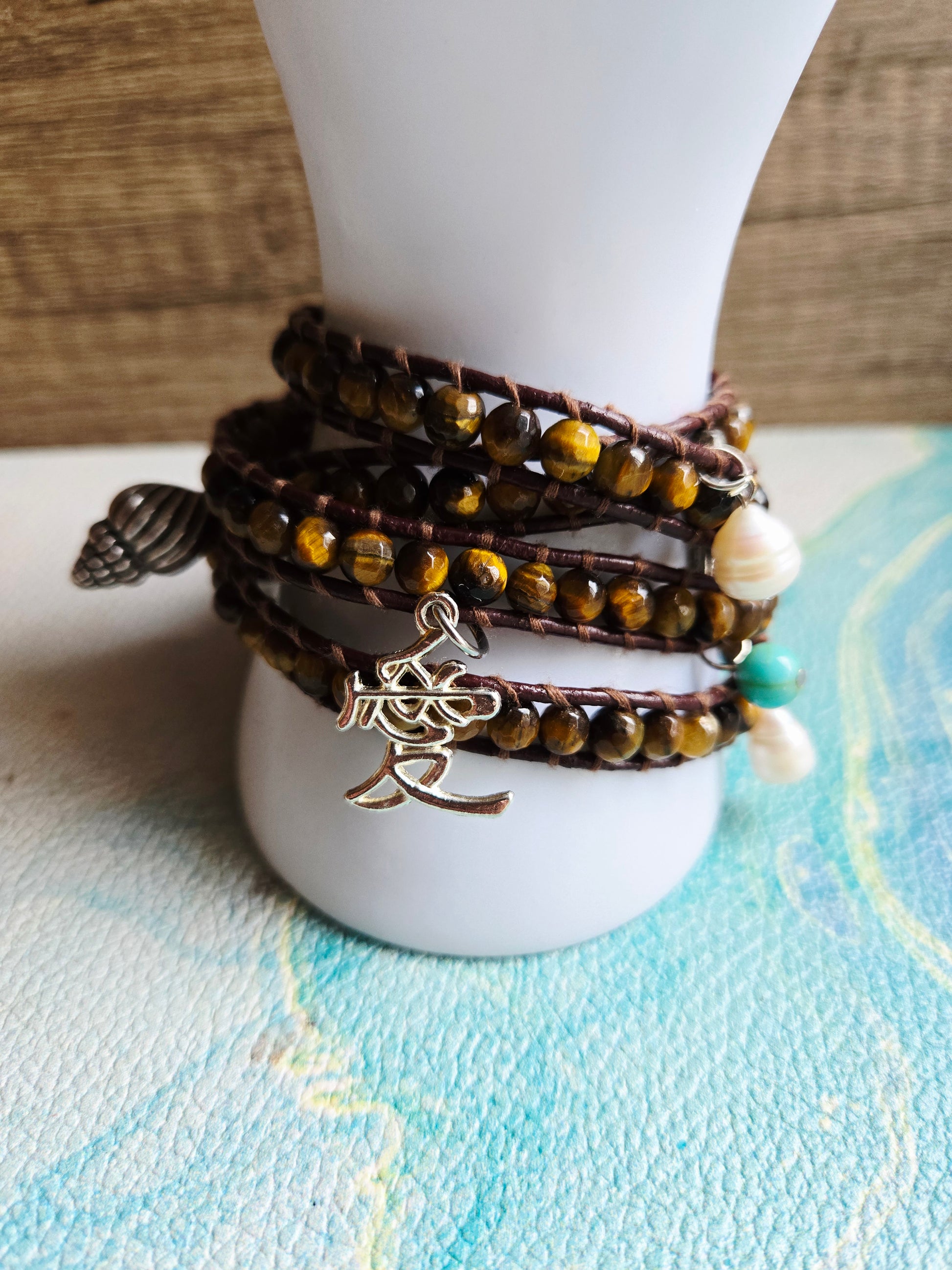 Channel your inner Boho Mermaid with this Tiger Eye Wrap Leather bracelet with pearl and marine charms and features a Chinese "Love" character. With silver accents.