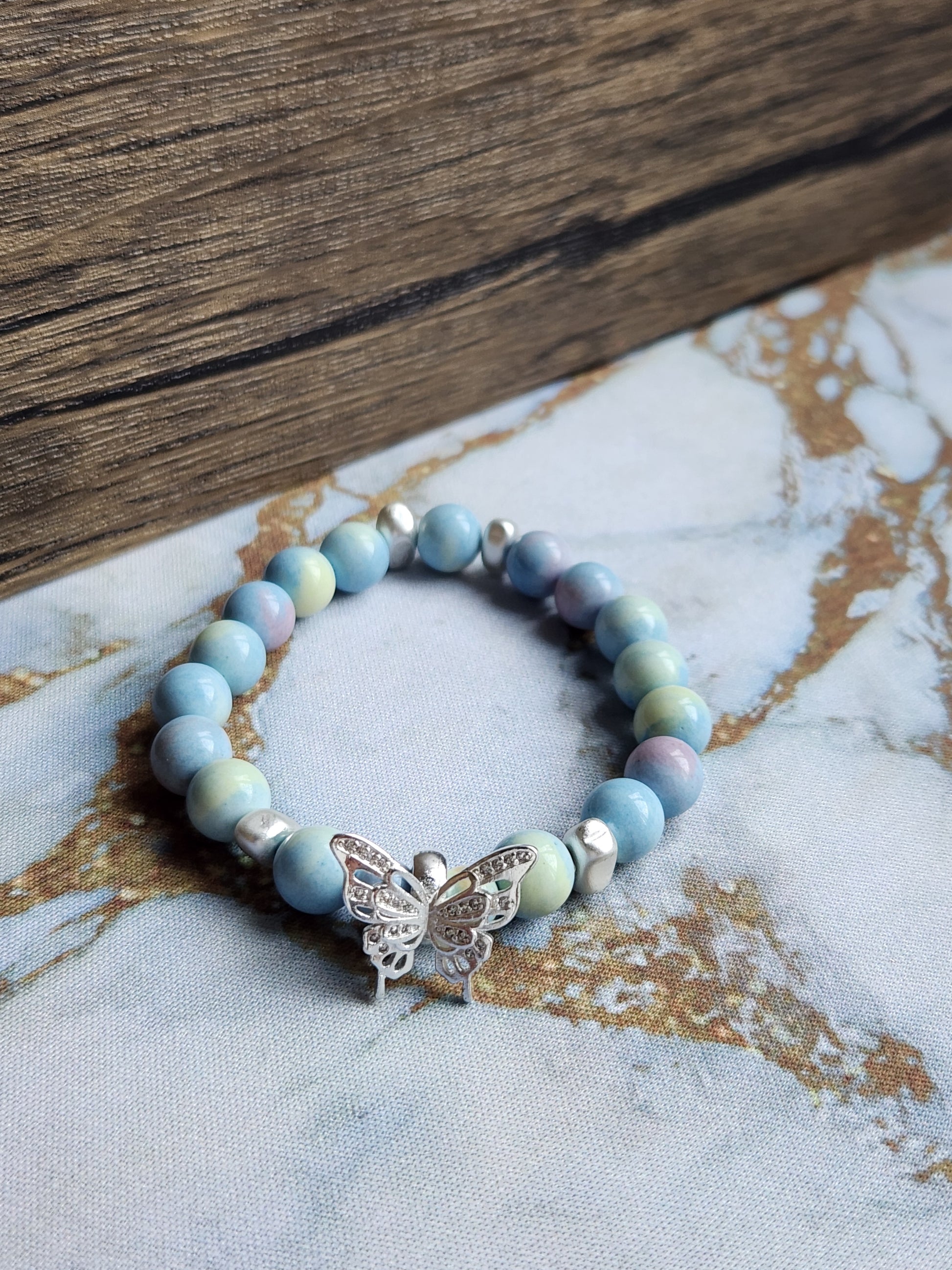 This dreamy bracelet is made with Alashan Rainbow Agate, accented in silver hematite and adorned with a beautiful 3-D butterfly charm. Alashan Agate is found only in the Gobi Desert. Wear this bracelet for its rebalancing and stabilizing energies.