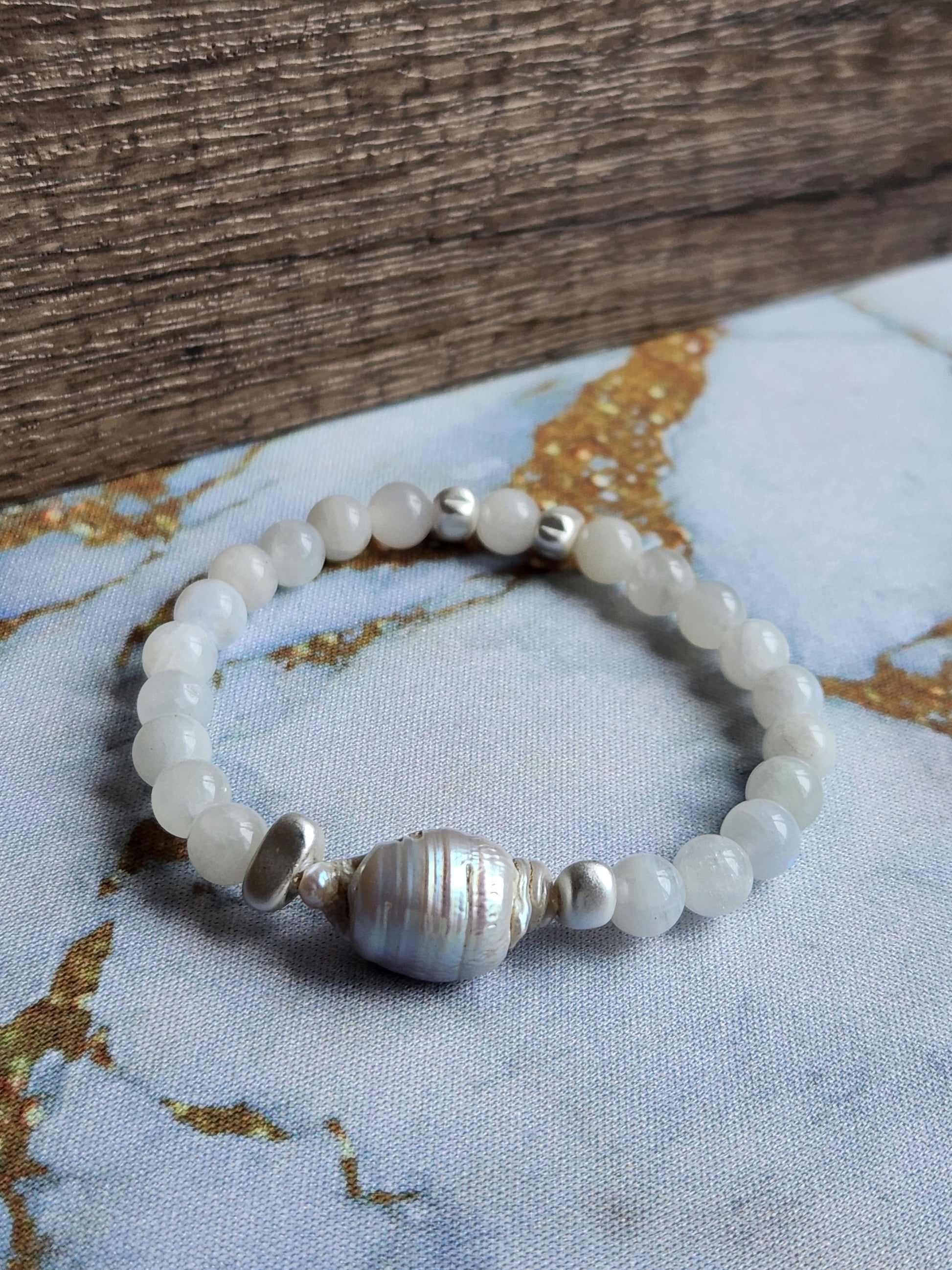 Crafted using the magical moonstone and a unique baroque pearl with ridges representing the lunar maria (seas on the moon), this bracelet can be worn for intuition, emotional balance, and can serve as a guiding light amidst life's chaos. Also useful in helping with our monthly endocrine changes. Beautiful on its own or when stacked!
