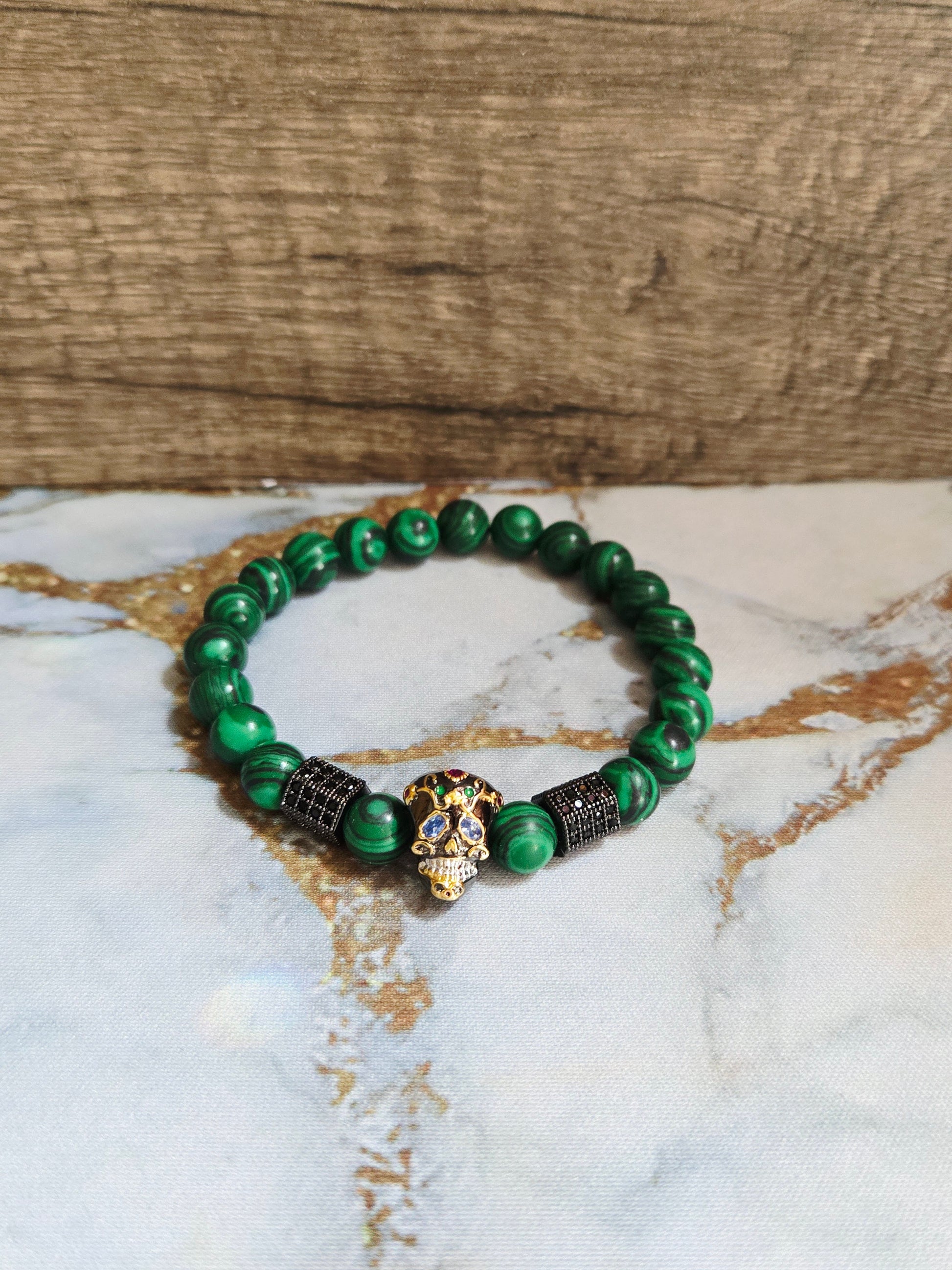 This Gold Skull Bracelet combines bold design with Malachite in celebration of life’s spirit with a touch of edge. Its striking skull motif symbolizes resilience and transformation, making it a sophisticated accessory that complements both casual and refined styles. Crafted to stand out, it adds a meaningful flair to your ensemble while honoring the vibrancy of life. With gold and gunmental accents.