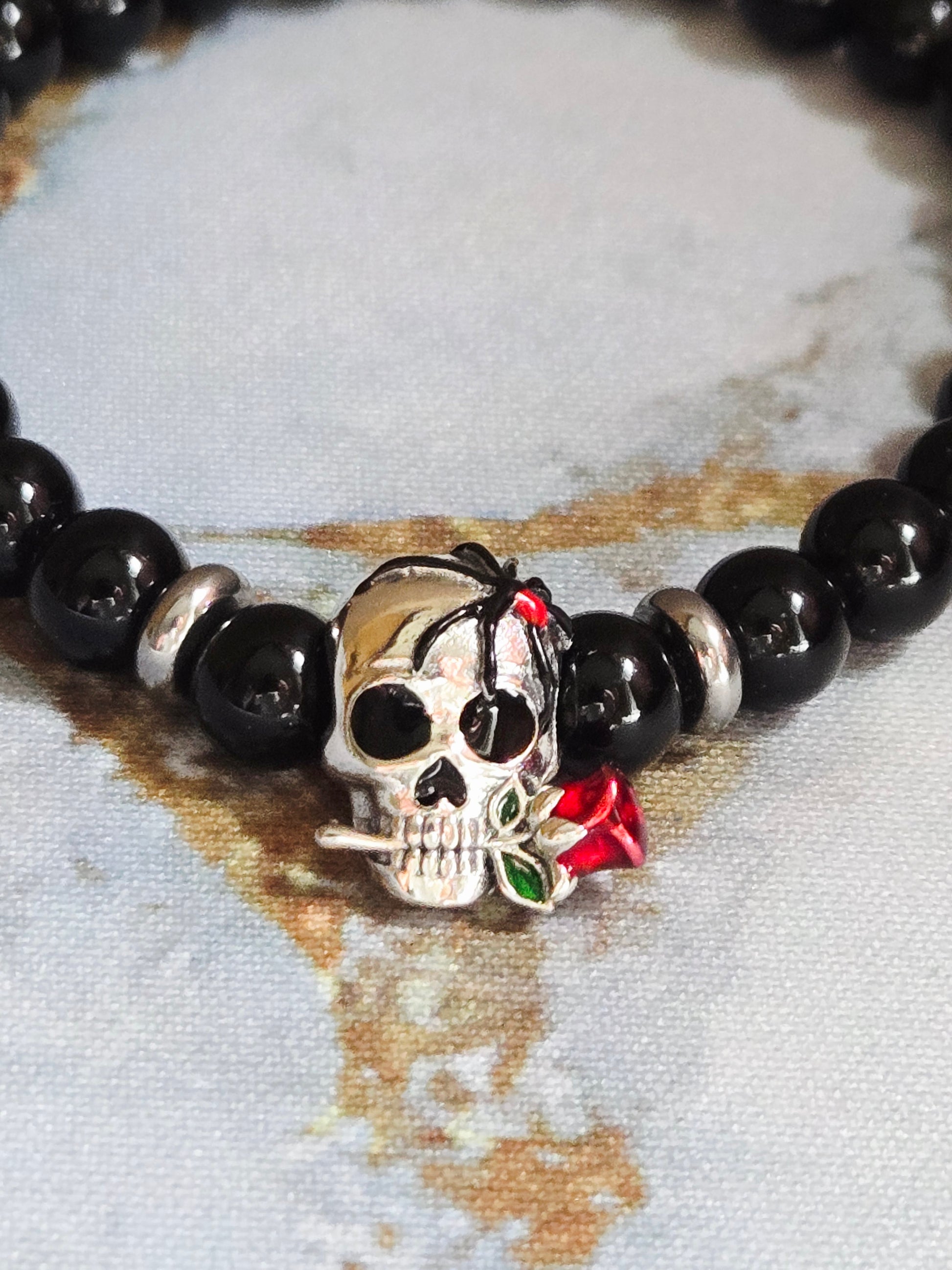 This Silver Skull Bracelet combines bold design with Obsidian in celebration of life’s spirit with a touch of edge. Its striking skull motif symbolizes resilience and transformation, making it a sophisticated accessory that complements both casual and refined styles. Crafted to stand out, it adds a meaningful flair to your ensemble while honoring the vibrancy of life. With silver accents.
