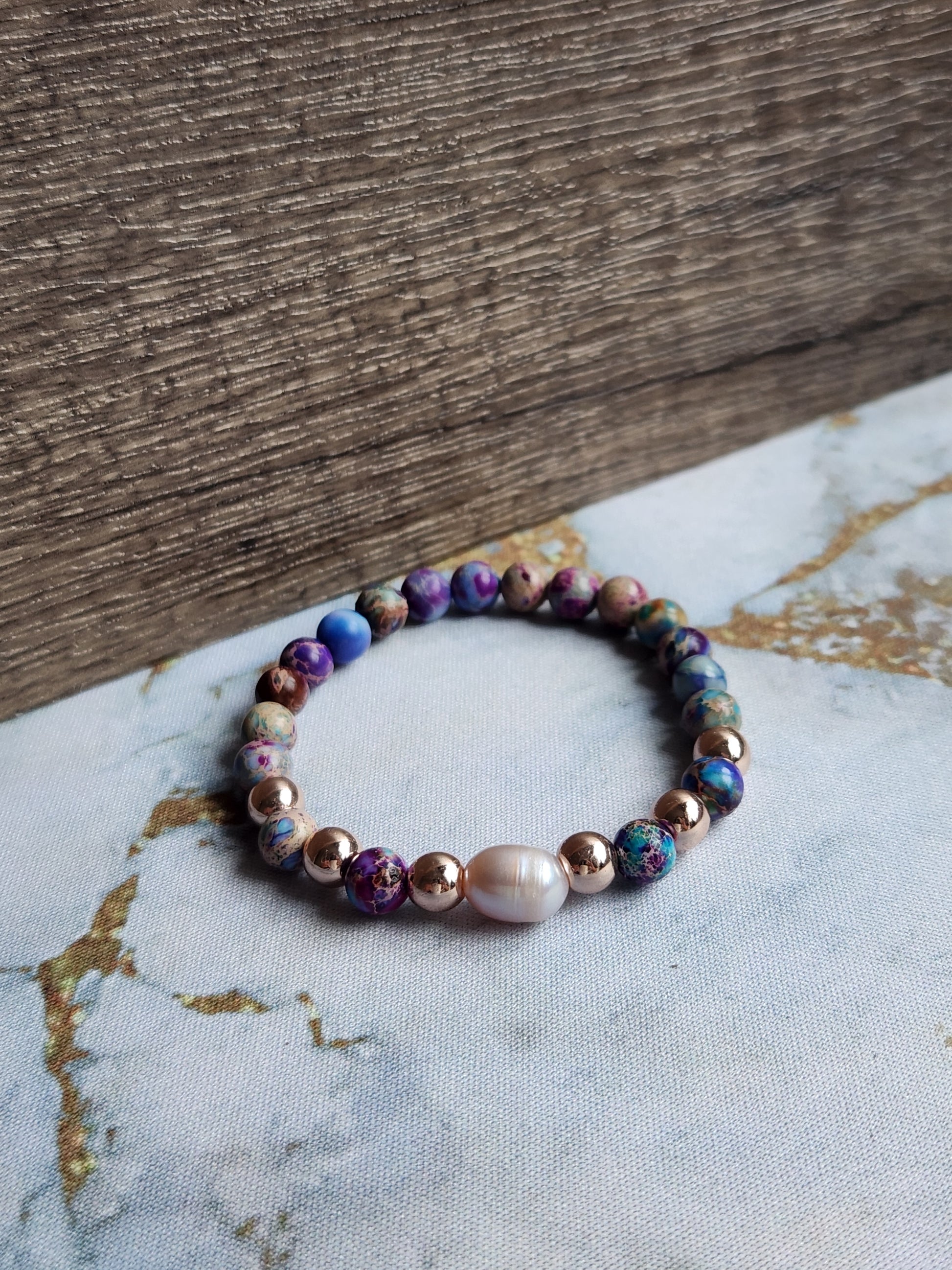 Designed using the rare 6mm Pink, Blue, Purple Sea Sediment Jasper, and a stunning pink Pearl, this bracelet is accented with rose gold, and can be used to support you during stressful times and allow you to find hope in darker times. Beautiful worn by itself or when stacked!