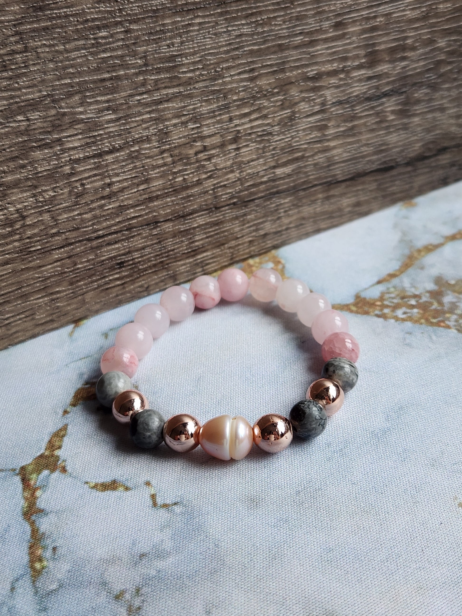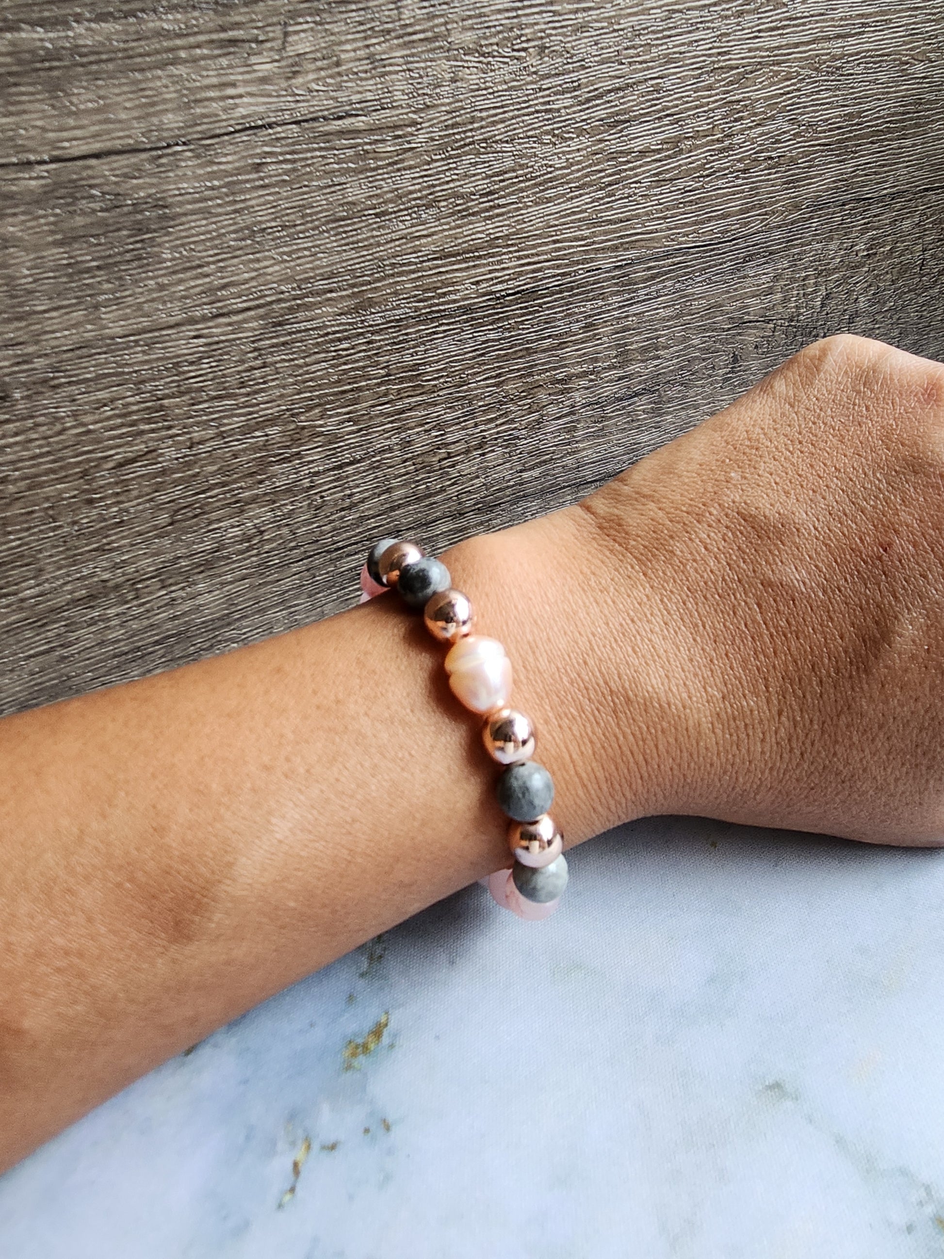 Rose Gold Strawberry Quartz, Grey Jasper and White Pearl Bracelet