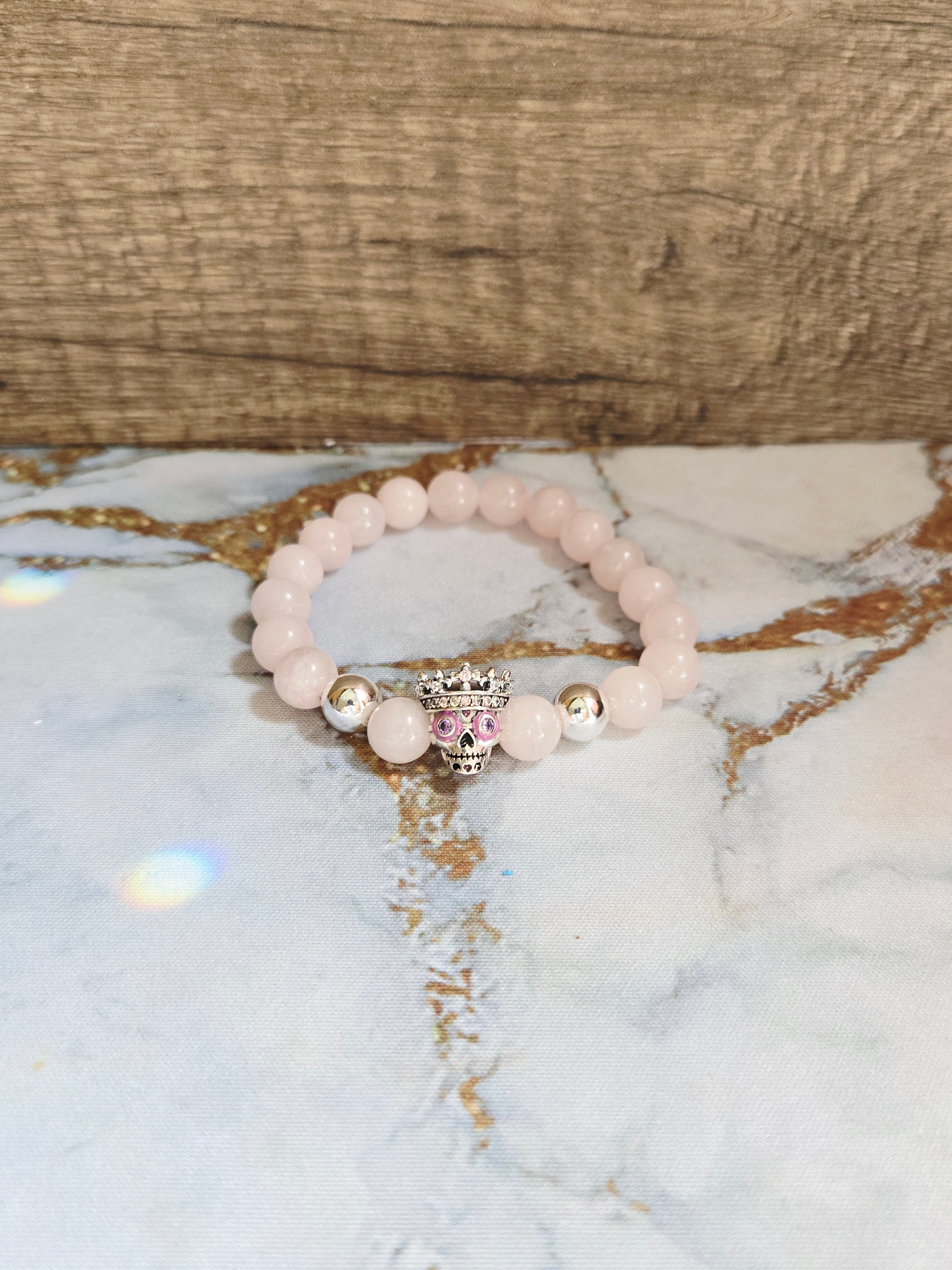 This Silver Skull Bracelet combines bold design with Rose Quartz in celebration of life’s spirit with a touch of edge. Its striking skull motif symbolizes resilience and transformation, making it a sophisticated accessory that complements both casual and refined styles. Crafted to stand out, it adds a meaningful flair to your ensemble while honoring the vibrancy of life. With silver accents.