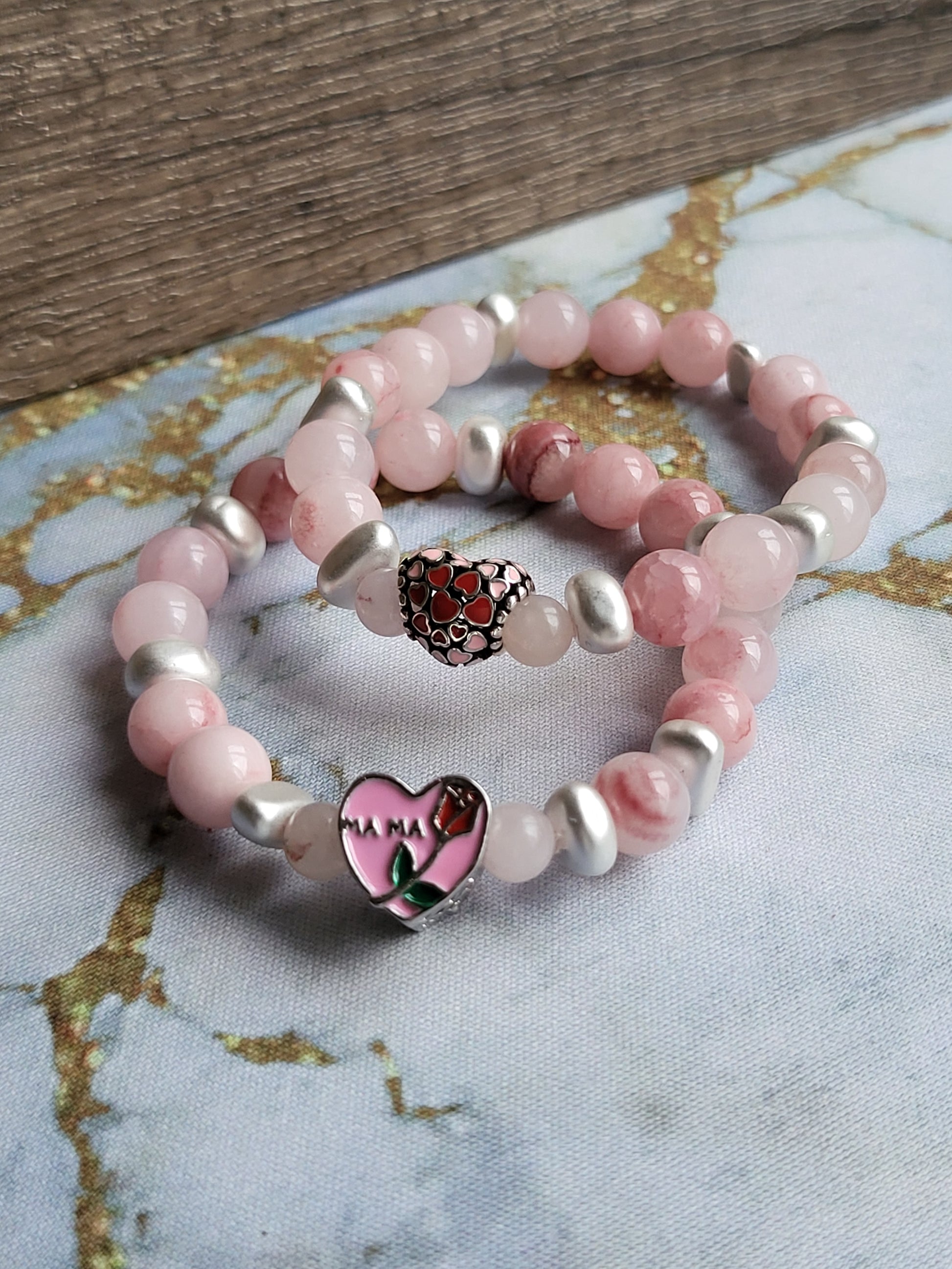 These Strawberry Quartz Bracelets with silver Heart Charms are accented with silver coated hematite. The Mum heart charm is in pink enamel and features the word "Mama"; the Me charm features pink and red enamel hearts. Can be purchased as a pair, or separately.