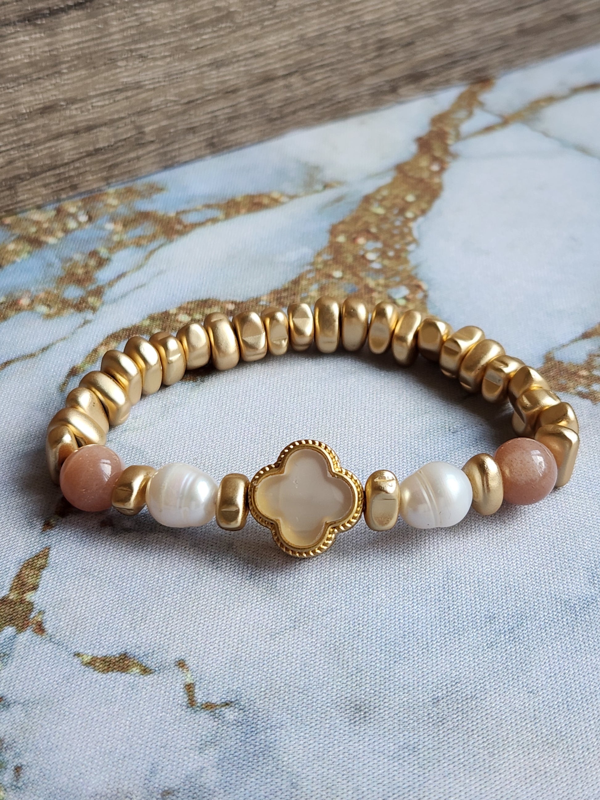 Designed using Sunstone and cultured white pearls, this bracelet is accented with brushed gold coated hematite and features a gold and resin blush pink leaf clover.