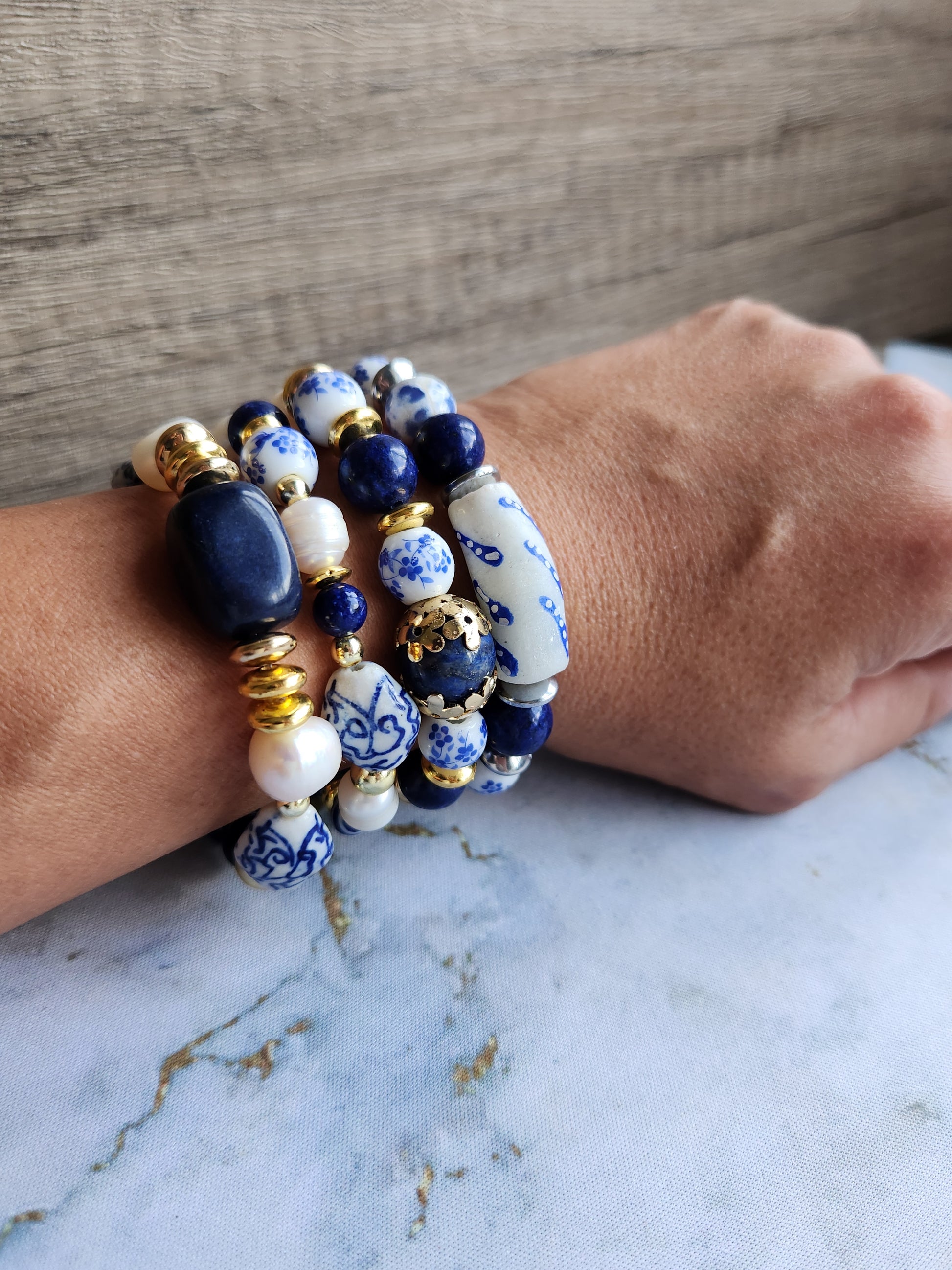 Reminiscent of the beautiful blue-glazed pottery and porcelain from the Tang Dynasty, this Lapis Lazuli, white Pearl bracelet with porcelain and clay beads can be worn daily by itself or stacked with others from the same collection.