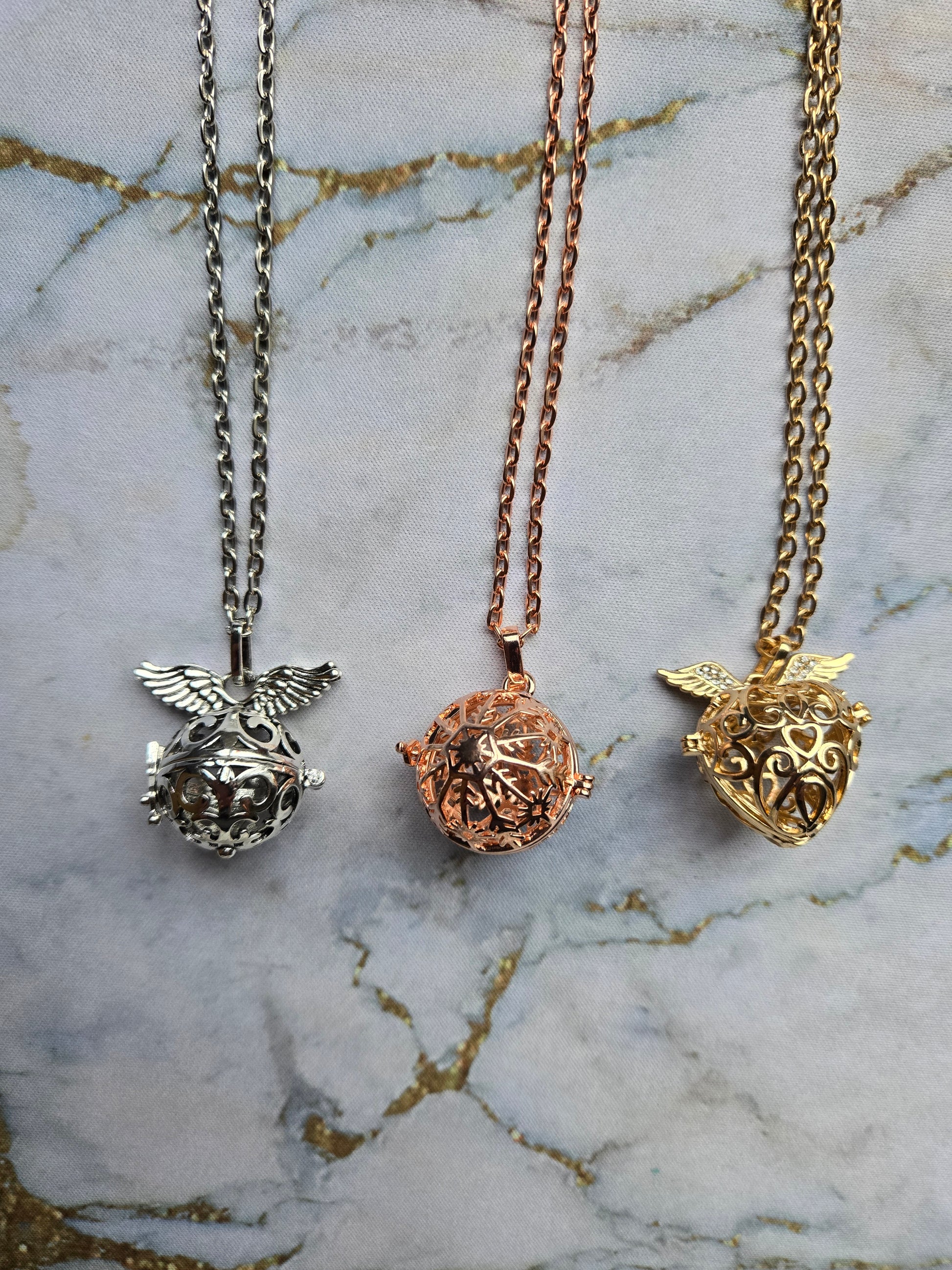 Large heart-shaped Rose Gold-plated Heart Stitch Diffuser Necklace, inspired by Harry Potter Series. 70cm drop.